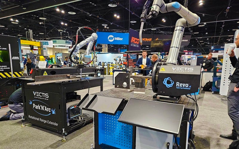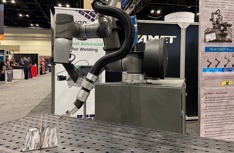 UR showcased welding robots and much more, including lasers, finishing, and press brake operation. Image used courtesy of Universal Robots via social media