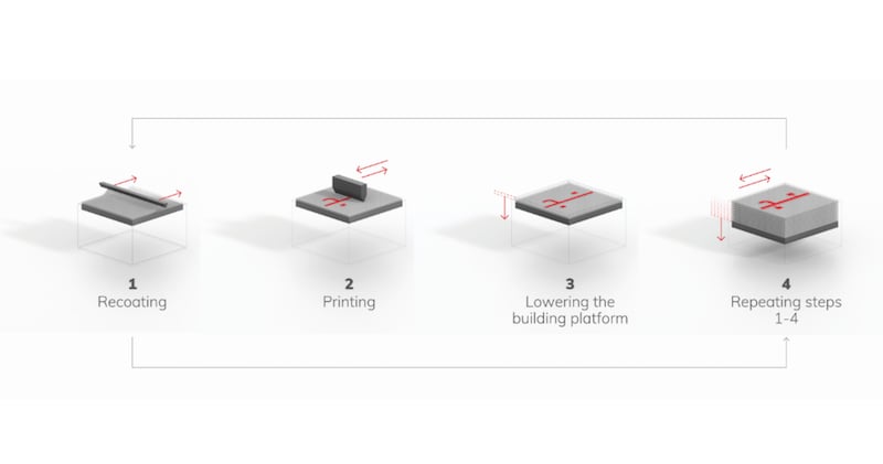 A diagram showing the binder jet process. Image used courtesy of Voxeljet
