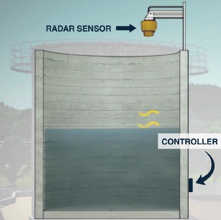 LevelCommand employs 80 gigahertz (GHz) radar sensors that transmit radio waves. These radio waves hit the surface of the solution. The radio waves bounce off, which is then picked up by the same sensor to detect the level in the bin/tank. Radio waves pass through dust, other particulate matter, and condensation, which would otherwise compromise capacitive and ultrasonic sensors. The radar sensor range options available are 25, 50, 100, or 400 feet.
