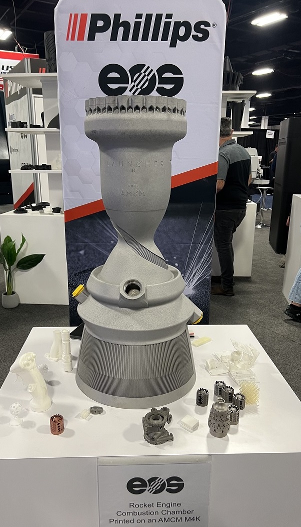 Phillips showcased the technology in a partnership with EOS North America, displaying the results of additive manufacturing for the aerospace industry in the form of a printed combustion chamber, reducing the complexity and time of assembly manufacturing, even though the printing itself is a slow process.