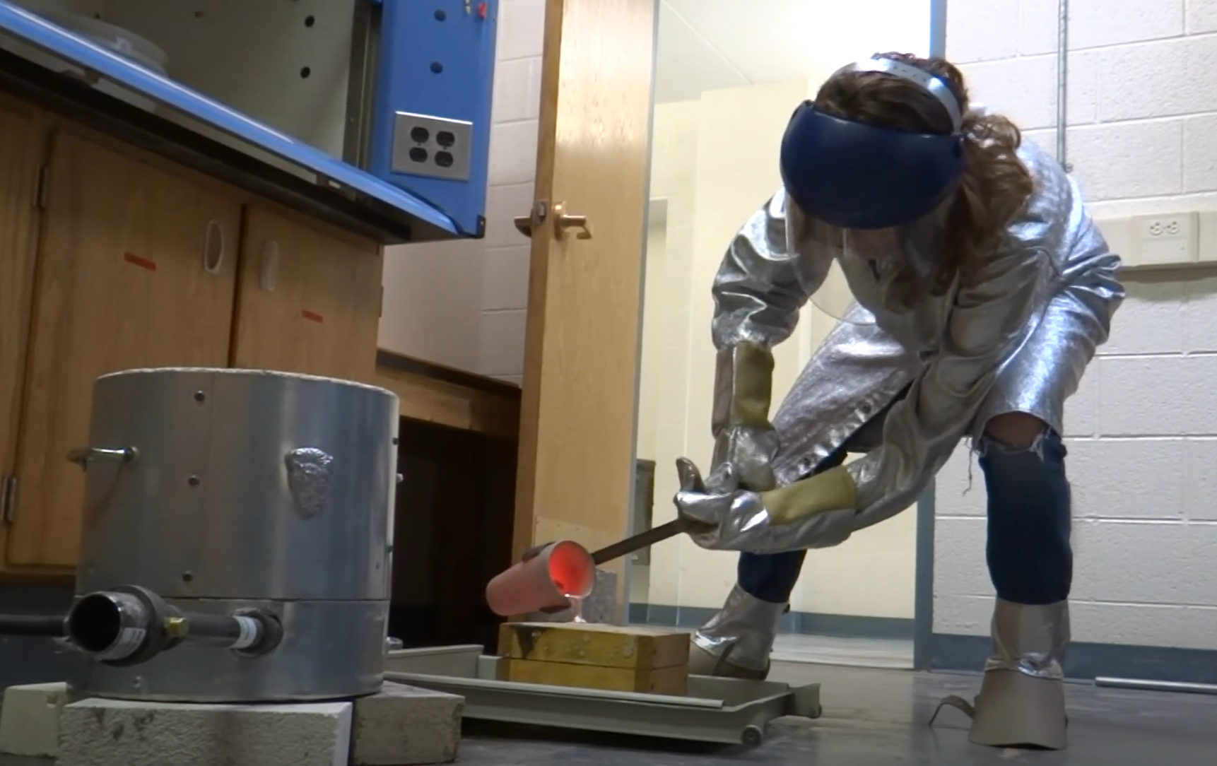 A student pours molten aluminum into a sand mold. Image used courtesy of author